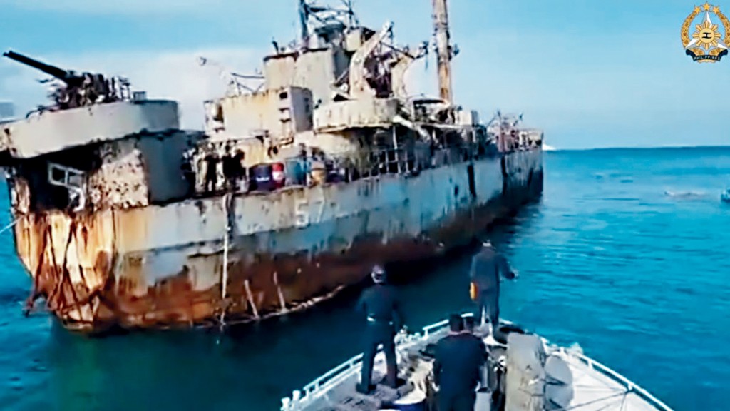 ▲菲律賓派民船向“坐灘”仁愛礁的軍艦送補給。