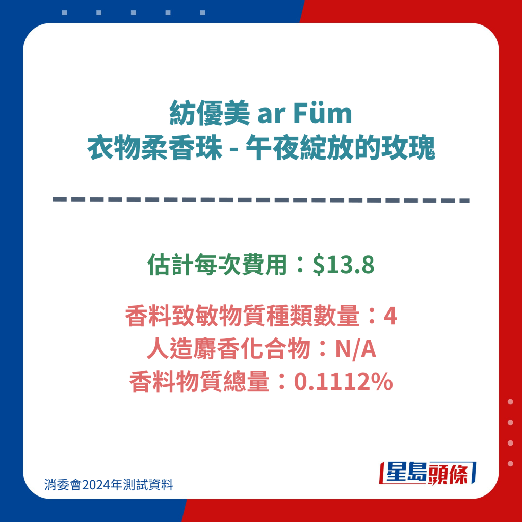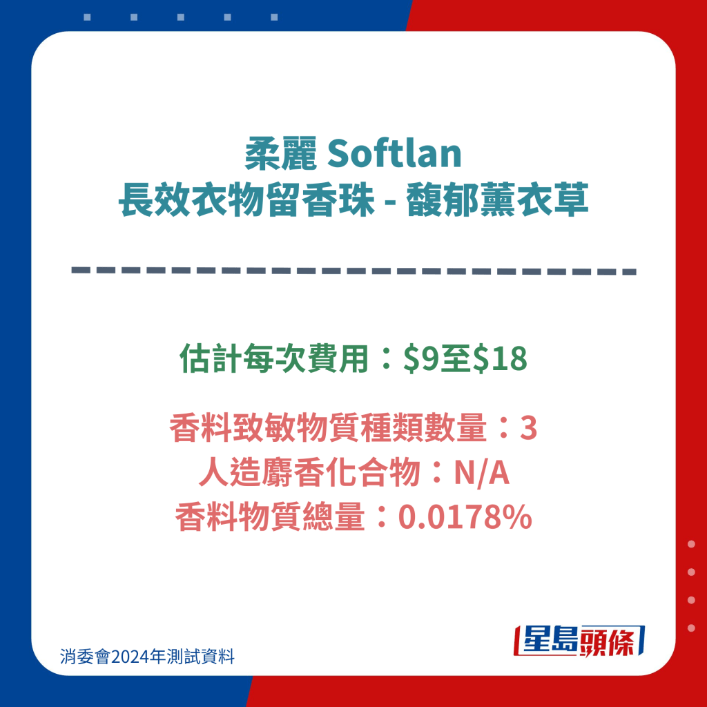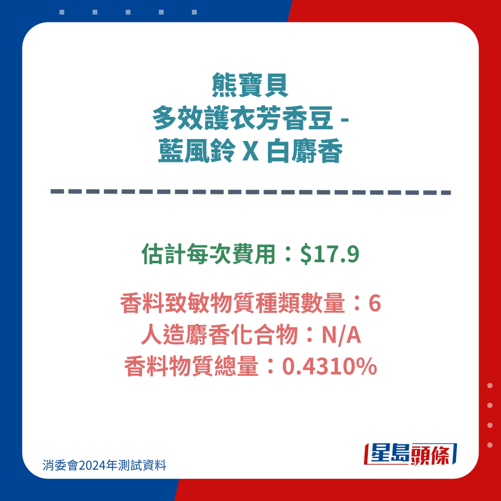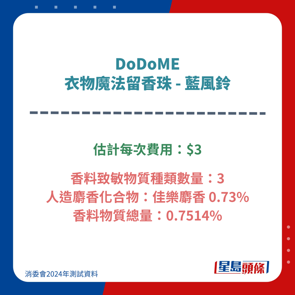 消委會從多個渠道,包括超級市場、家品店及網上商店,選購了12款衣物清香珠進行評測。 其中,六款產品宣稱具備衣物柔順效果,而其余樣本則并未作出此類聲明。 這些樣本的售價范圍介于38元至179元之間。 根據檢測結果,所有采集的樣本均檢測出不同類型的香料致敏物質,這些物質的總量范圍介于0.0023%至0.6720%之間。