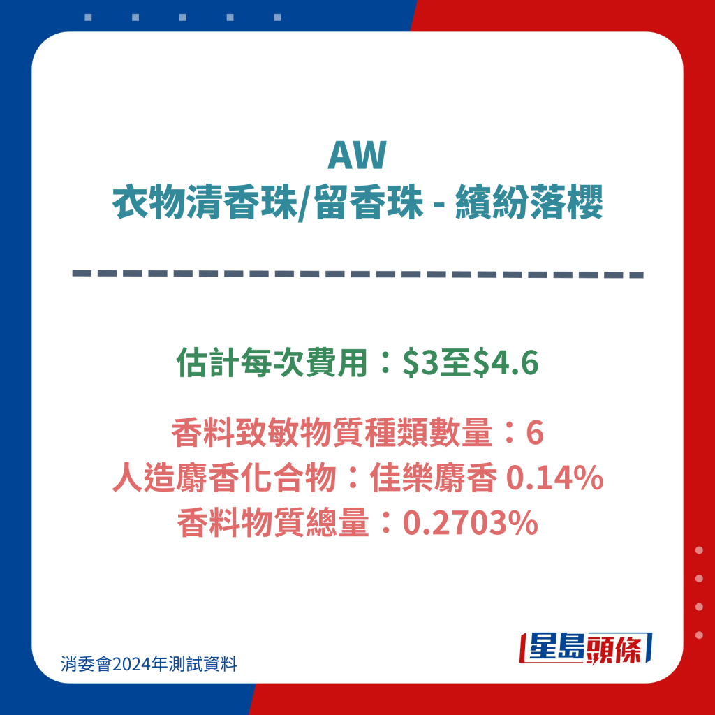 消委會衣物清香珠|衣物清香珠作為一種新興的清潔產品,越來越受到消費者的青睞。 許多衣物清香珠產品宣稱其香氣在紡織物上能持續(xù)長達12周,讓穿著者在使用后仍能享受到持久的清香。 然而,這些香味的持久性背后,可能隱藏著一些潛在的風險。消費者委員會(消委會)為了解香港市場上衣物清香珠產品的品質狀況,針對12款相關產品進行了抽查,當中包括熊寶貝、柔麗、蘭諾(Lenor)、詩樂氏等常見品牌,結果顯示,所有樣本皆檢測出各種香料致敏物,當中有4款更檢出可能對環(huán)境造成影響的佳樂麝香。 對于皮膚及呼吸系統(tǒng)較為敏感的消費者,建議應謹慎使用這類香味產品。 此外,個別品牌衣物清香珠之價格、用量懸殊,若家庭洗衫頻密,每年花費可達$4,358,值得消費者留意。
