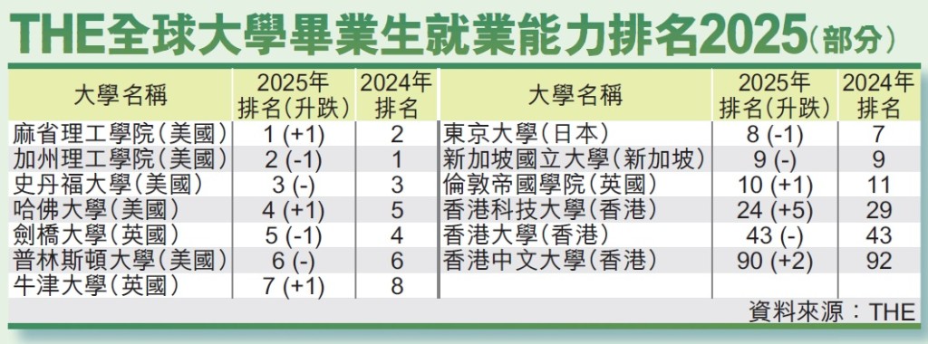 THE昨公布全球大學畢業(yè)生就業(yè)能力排名2025,上榜的250間大學來自超過40個國家及地區(qū)。在最新排名中,麻省理工學院重拾榜首位置,成為畢業(yè)生就業(yè)能力最強的院校;加州理工學院較去年下跌一位,排全球第2位;史丹福大學維持第3位。