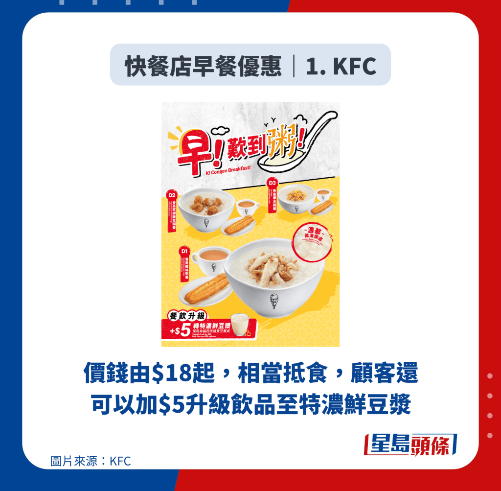快餐店早餐優(yōu)惠|1. KFC 家鄉(xiāng)雞粥/粟米粥配油炸鬼$18起