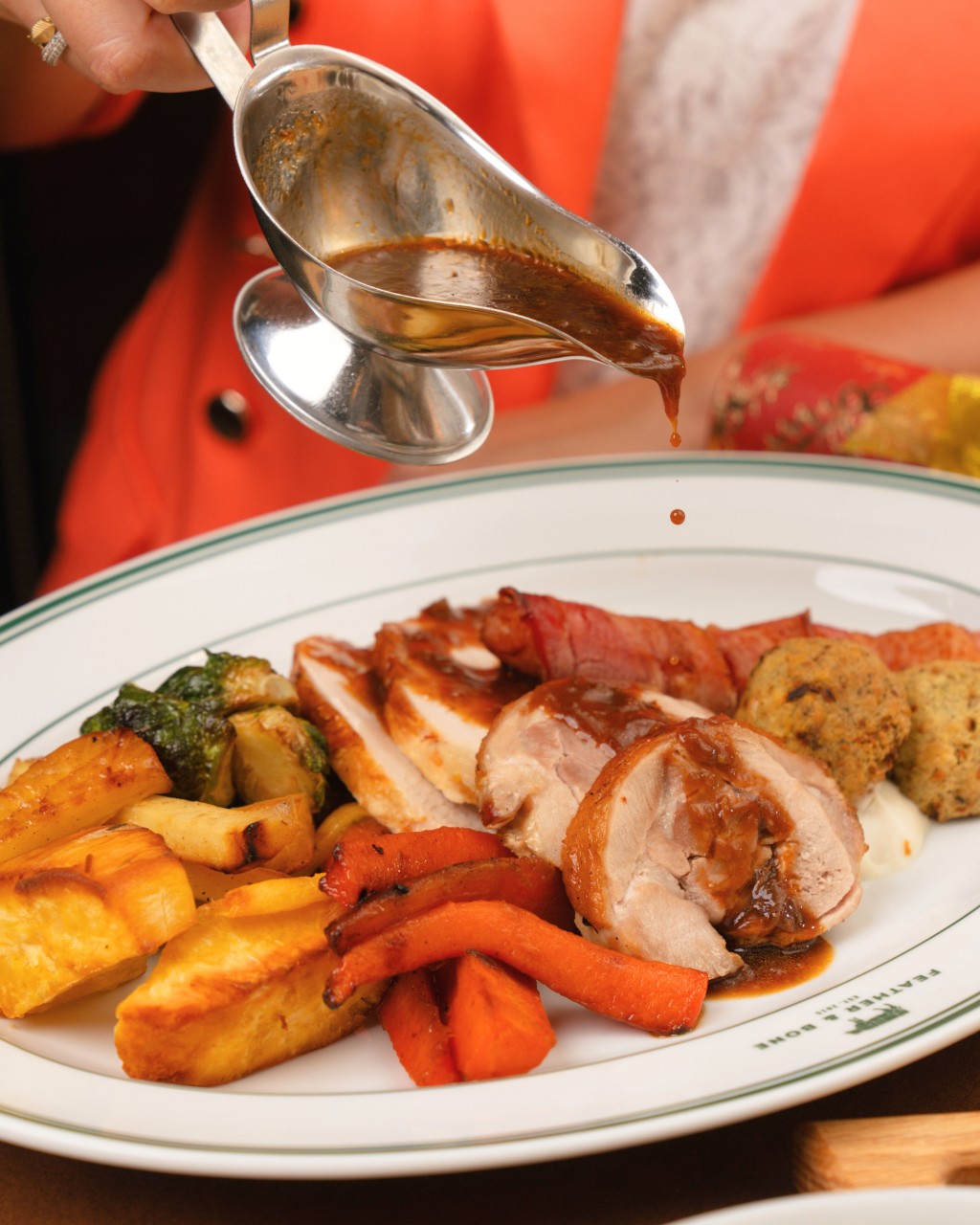 四道菜的節(jié)日餐單,前菜選擇眾多,層次豐富,肉香深邃的乳鴿餡派,以至咸鮮開胃的魚子醬配熟成三文魚,有重有輕,任君選擇!主菜選擇也是節(jié)慶經(jīng)典,火雞來自英國Kelly Bronze農(nóng)場(chǎng),被英媒譽(yù)為火雞界“勞斯萊斯”,今次以雞卷形式登場(chǎng),雞皮包著胸肉低溫慢烤,吃來不會(huì)干柴,楓糖焗小椰菜、栗子、煙熏煙肉等老派配菜,叫人份外暖意窩心。結(jié)尾再來英式圣誕布甸黏糯的質(zhì)地,伴上白蘭地牛油,口感飽滿至極,過節(jié)應(yīng)當(dāng)如此。