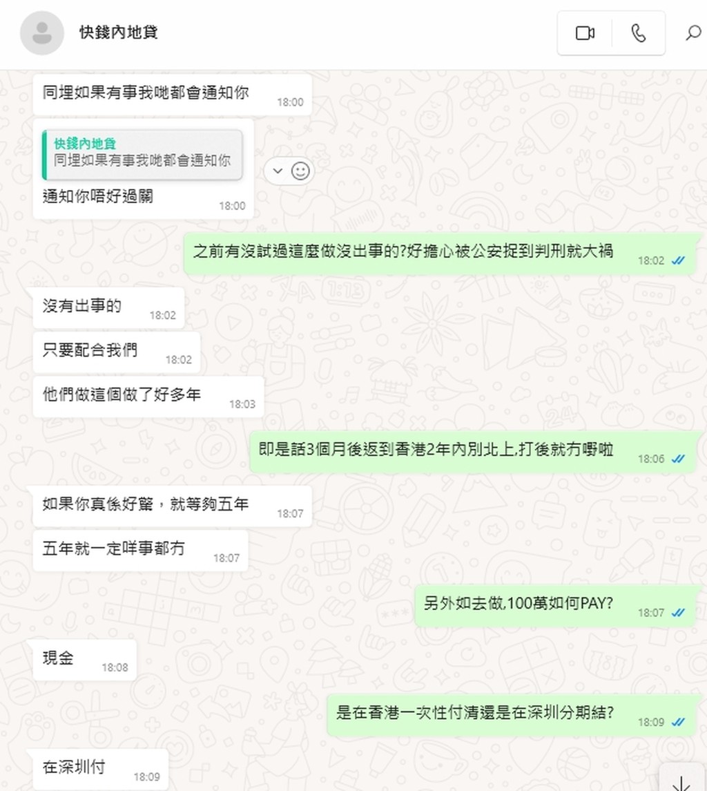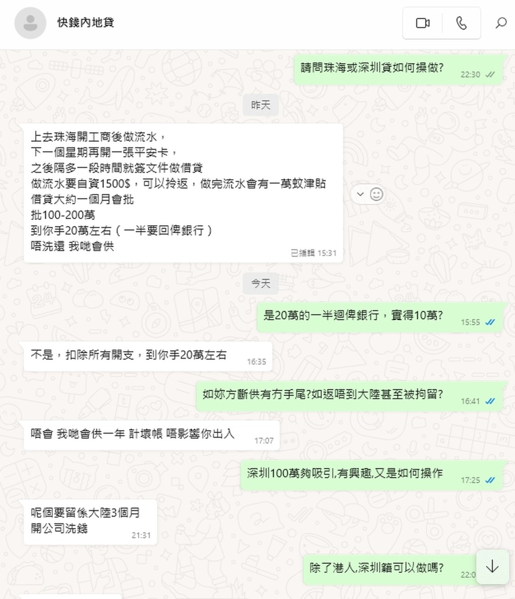 “深圳內(nèi)地公司,3個月(需長駐、包食宿),到手金額100萬,每月生活費(fèi)2萬,事后2年不得返去(內(nèi)地)……”報酬豐厚的“北上發(fā)財”廣告近日充斥社交平臺,相信是為了利誘港人從事不法勾當(dāng),記者遂通過WhatsApp聯(lián)系一名自稱姓黃的發(fā)文者,獲告知是協(xié)助其老板洗錢。