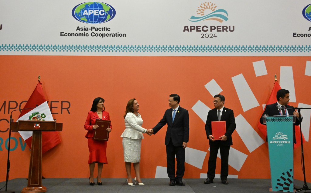▲李家超在秘魯期間,見(jiàn)證了香港與秘魯簽署《自由貿(mào)易協(xié)定》。政府新聞處