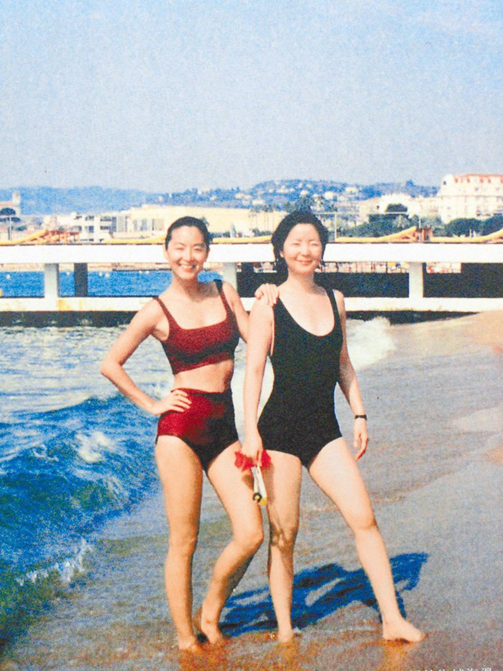 林青霞(左)公開與鄧麗君在坎城海邊的珍貴泳裝照,由好友沈云攝影。(林青霞提供)
