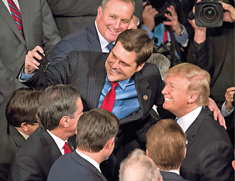 有法律專家指出,特朗普提名堅(jiān)定盟友蓋茨(中)擔(dān)任司法部長(zhǎng),顯示他決心以起訴形式報(bào)復(fù)政敵。 法新社資料圖片