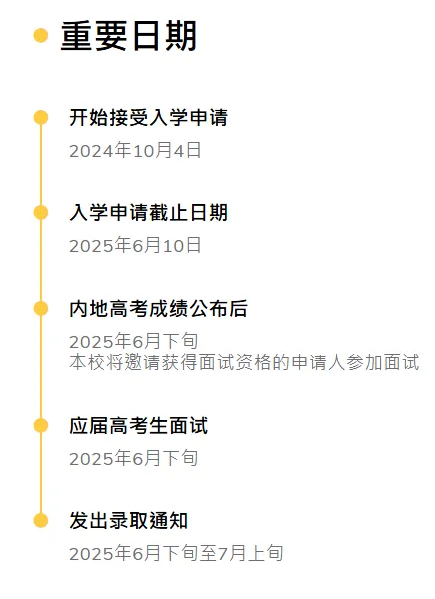 申請人必須于2025年6月11日前通過網(wǎng)上申請系統(tǒng)補交高考考號并在6月下旬內(nèi)地高考成績公布后盡快于網(wǎng)上申請系統(tǒng)填寫其高考成績。高考成績公布后,香港科技大學將根據(jù)當年實際申請情況,并參考各省市的一批線及內(nèi)地重點大學的分數(shù)線等,訂定各學院的面試分數(shù)線要求。