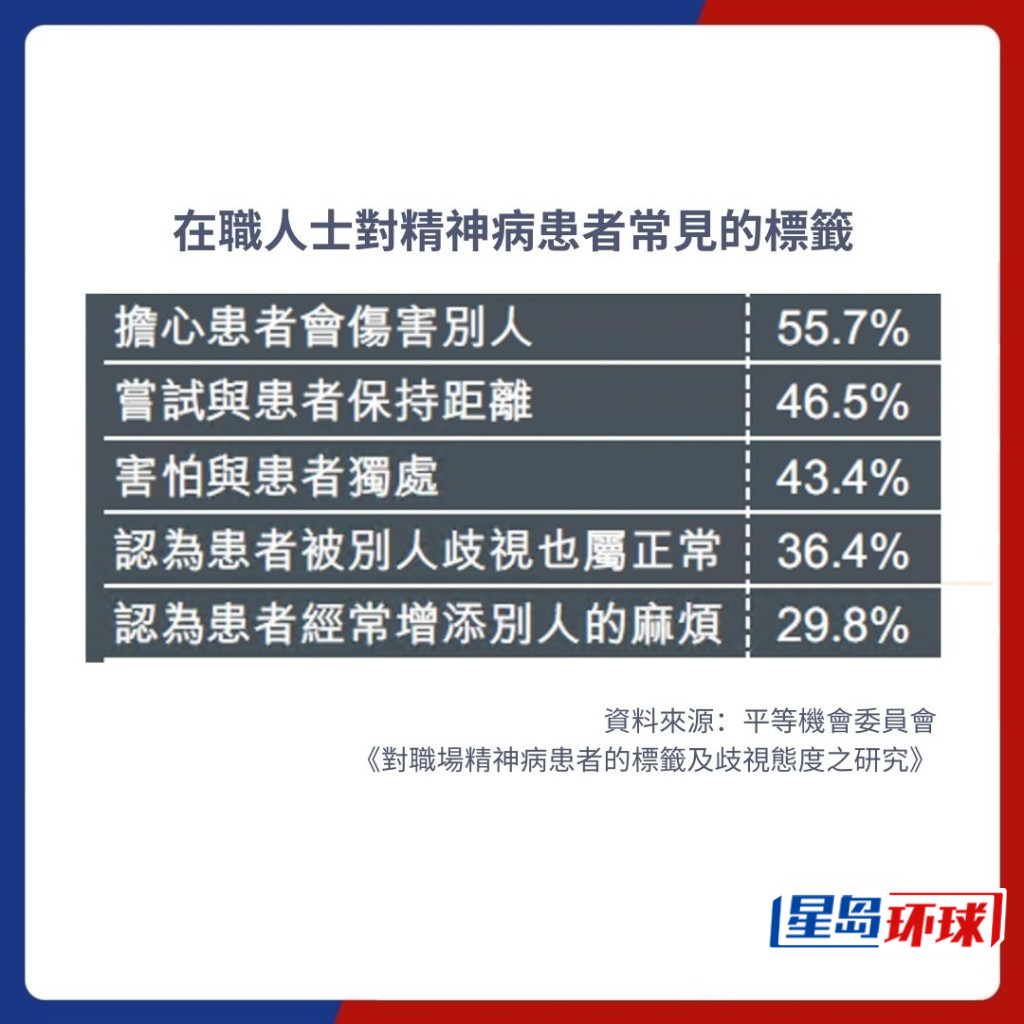 事實(shí)上,平等機(jī)會(huì)委員會(huì)曾委托香港教育大學(xué)心理學(xué)系進(jìn)行研究,在2020年以問卷形式,訪問593名在職工作人士及265名精神病患者,發(fā)現(xiàn)分別有超過30%的精神病患者表示在求職、在職及離職過程中經(jīng)歷歧視。此外,91.9%受訪在職人士知道香港的《殘疾歧視條例》,惟對(duì)精神病患者仍有常見標(biāo)簽;55.7%的人擔(dān)心精神病患者會(huì)傷害他?,另有46.5%會(huì)嘗試與他們保持距離。
