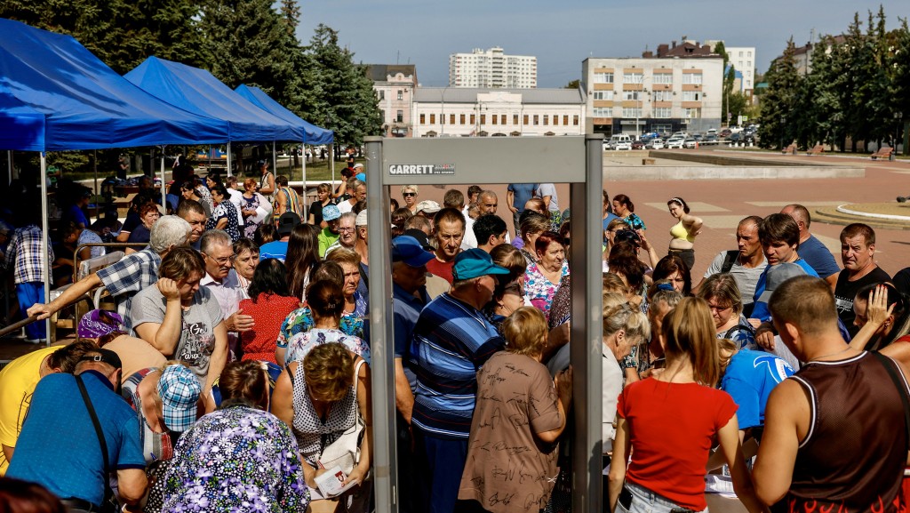 從庫(kù)爾斯克地區(qū)撤離的居民在人道主義援助物資分發(fā)中心排隊(duì)。