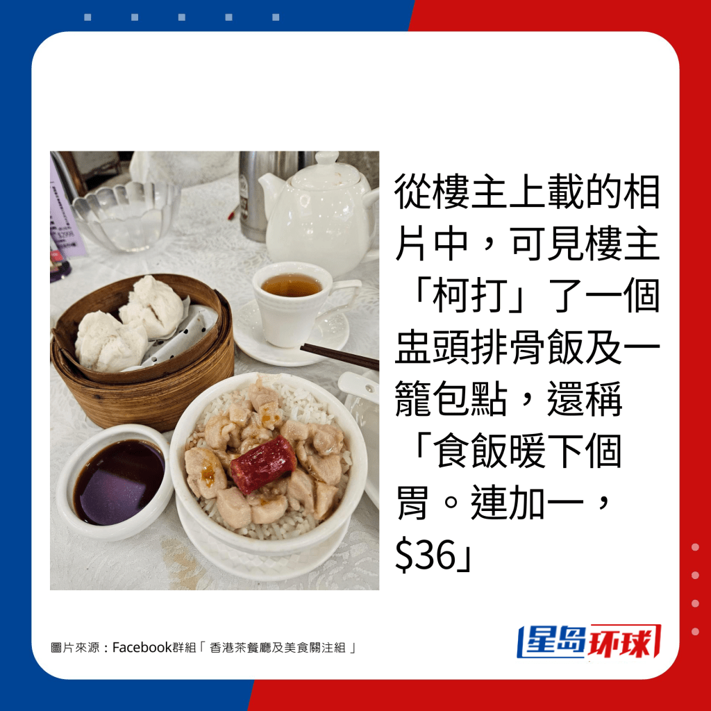 從樓主上載的相片中,可見樓主「柯打」了一個(gè)盅頭排骨飯及一籠包點(diǎn),還稱「食飯暖下個(gè)胃。連加一,$36」