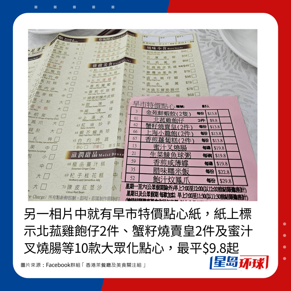 另一相片中就有早市特價(jià)點(diǎn)心紙,紙上標(biāo)示北菰雞飽仔2件、蟹籽燒賣皇2件及蜜汁叉燒腸等10款大眾化點(diǎn)心,最平$9.8起。