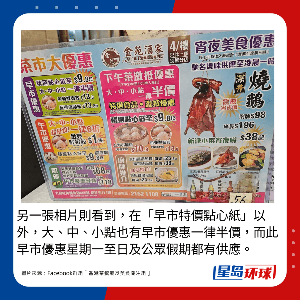 這位網(wǎng)民在Facebook群組“香港茶餐廳及美食關(guān)注組”發(fā)帖,表示由于早上天氣“凍凍地又有雨”的關(guān)系,所以提早出門口并于旺角一間酒樓嘆早茶,發(fā)現(xiàn)這間酒樓超抵早茶,“連加一,$36”。從樓主上載的相片中,可見樓主點(diǎn)餐一個(gè)盅頭排骨飯及一籠包點(diǎn)。樓主還分享早市特價(jià)點(diǎn)心紙,北菰雞飽仔2件、蟹籽燒賣皇2件及蜜汁叉燒腸等10款大眾化點(diǎn)心,最平$9.8起。從另一張相片可見,“早市特價(jià)點(diǎn)心紙”以外,大、中、小點(diǎn)也有早市優(yōu)惠一律半價(jià),此早市優(yōu)惠星期一至日都有供應(yīng)。惟要留意,星期日及公眾假期的結(jié)帳離座時(shí)間提早30分鐘,半價(jià)的大、中、小點(diǎn)則需再加$2。