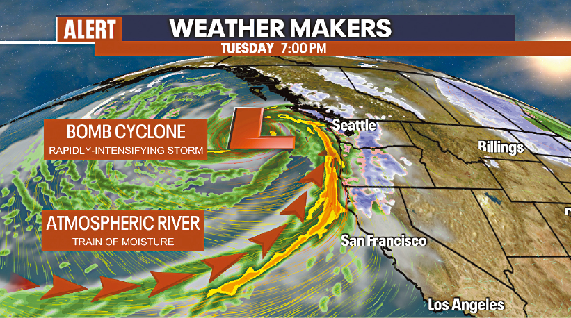 國(guó)家氣象局發(fā)出警告,表示西岸多州同時(shí)面臨強(qiáng)烈的“大氣河流”(atmospheric river)及“炸彈氣旋”(bomb cyclone)夾擊,加州北部、俄勒岡州和華盛頓州可能迎來(lái)颶風(fēng)程度的狂風(fēng),加上大雨、洪水以及高海拔地區(qū)的降雪,3個(gè)州份或許面對(duì)停電風(fēng)險(xiǎn)。