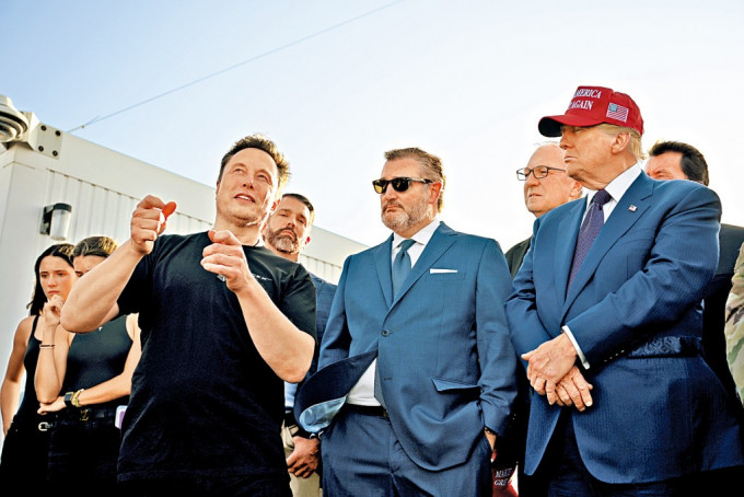 ▲火箭升空前,馬斯克向特朗普和參議員克魯茲(中)等人解說(shuō)。