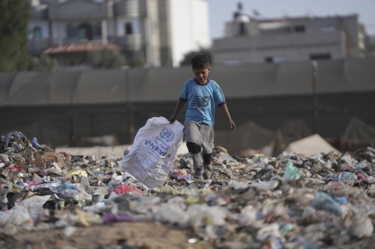 當?shù)貢r間11月17日,一名巴勒斯坦兒童在加沙地帶一處垃圾填埋場搜尋物資