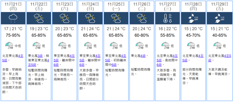 香港小雪節(jié)氣當(dāng)日及其后天氣: