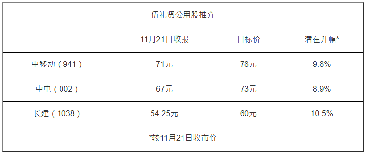 至于公用股心水,伍禮賢看好中移動(dòng)(941)、中電、長(zhǎng)建,背后揀股理念是看盈利能力??紤]中移動(dòng)并非完全是息口因素,而是公用股當(dāng)中,現(xiàn)時(shí)以中資電訊股增長(zhǎng)動(dòng)力最強(qiáng),盈利能力高。以上三只股票現(xiàn)價(jià)均可買入,目標(biāo)價(jià)分別看78元、73元、60元,均潛在看升約一成。