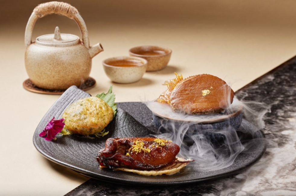 前菜三重奏包括花雕醉鮑魚、海苔蟹粉脆藕餅和桂花蜜汁香煎金蠔,三重海鮮風(fēng)味。