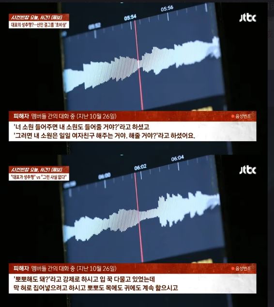 節(jié)目又公開了該成員與隊友的對話錄音,內容透露她遭到事務所老板性騷擾。該成員表示自己向老板提出退團,老板就對她說:“如果我?guī)湍銓崿F愿望,那你也要實現我的愿望。我希望你做我的一日女友,你愿意嗎?”之后哭訴被對方強吻、試圖用舌頭侵犯,還有摸胸、摸屁股等惡行,過程長達2小時,令她情緒崩潰,決定將受害一事告訴父母。