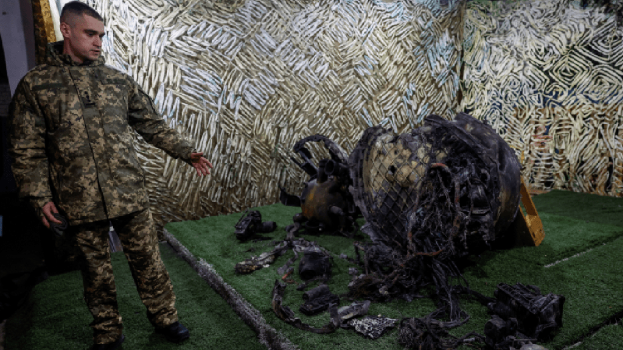 ▲上周四襲擊烏克蘭第聶伯羅市的俄新高超音速導(dǎo)彈“榛樹”的碎片,在烏國一間鑒證中心展示。(路透社)