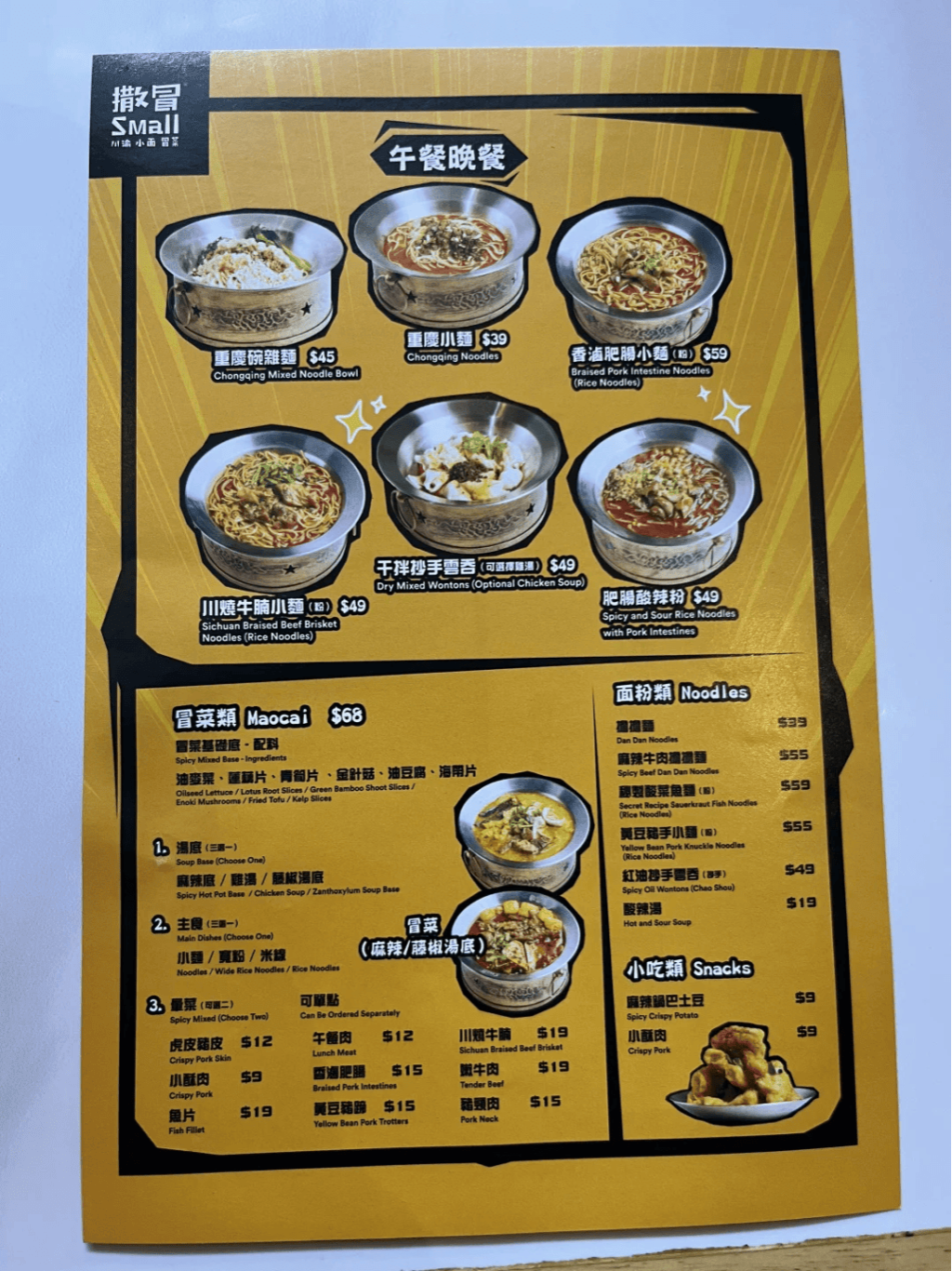 “撒冒”的招牌乾拌面售價(jià)由$39起,款式包括泡椒豬肝拌麵、蒲燒鰻魚(yú)拌麵及重慶豌雜麵等,當(dāng)中部分食材更是由成都直送,并由當(dāng)?shù)刂鲝N監(jiān)修出品。另一主打冒菜系列,則提供4款湯底,包括麻辣、藤椒、金湯酸辣及鹿茸雞湯底,更有超過(guò)20款材料選擇,如巴掌肥牛、嫩牛肉、虎皮鳳爪、香滷肥腸等。