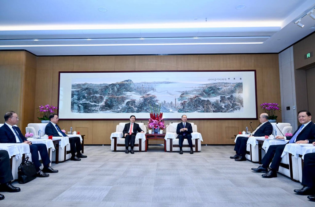 黃坤明、王偉中與李家超、鄭雁雄率領(lǐng)的香港工商界代表團舉行工作會見。