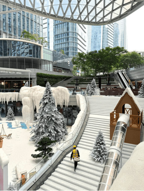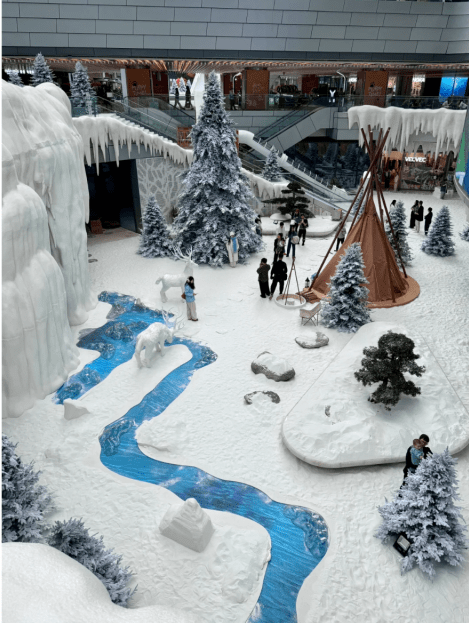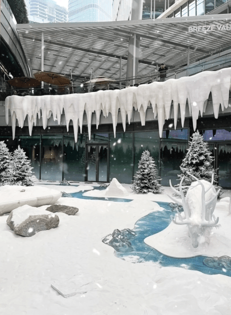 近日,位于深圳南山區(qū)的商場(chǎng)“萬(wàn)象前?!本统饩拶Y吸客,于今個(gè)冬天在中庭位置打造面積約1,300平方米的冰雪造景,加入麋鹿、雪兔、雪地露營(yíng)帳篷、圣誕樹(shù)等的裝飾擺設(shè),不定時(shí)還會(huì)噴灑人造雪,打造飄雪效果,讓賓客猶如置身冬日雪地當(dāng)中。
