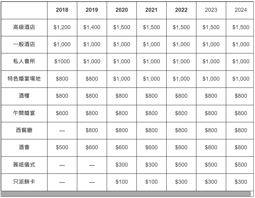 2. 一般酒店、私人會(huì)所、特色婚宴場地:維持$1,000