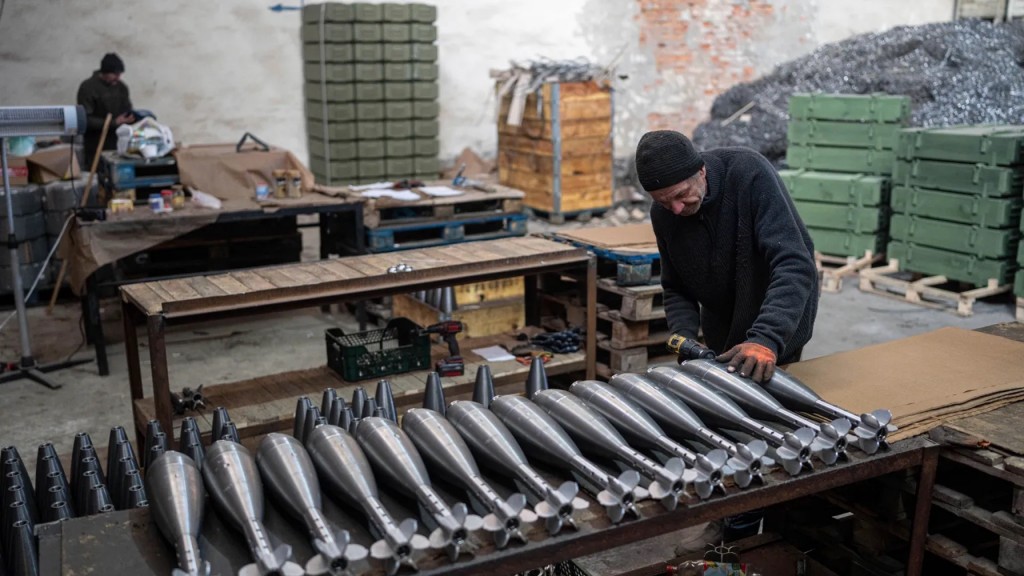 ▲工人在烏克蘭一間工廠內組裝迫擊炮彈。 美聯(lián)社