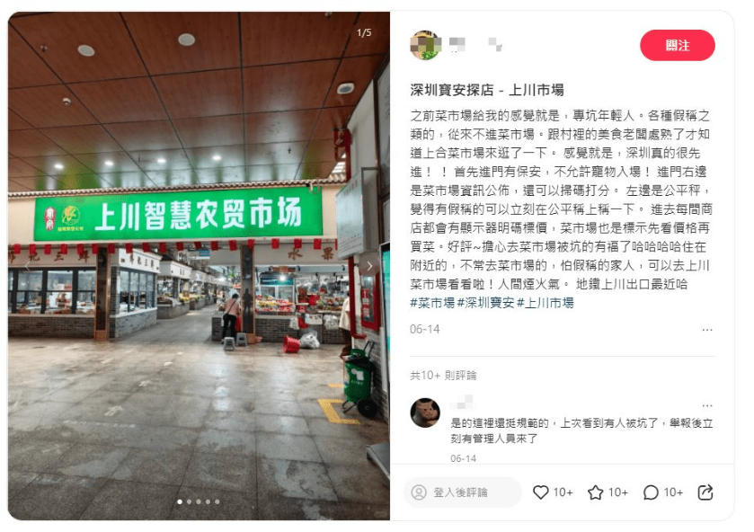 另一位小紅書(shū)帖主則稱(chēng)自己以往因怕被騙,所以從來(lái)不進(jìn)菜市場(chǎng),“之前菜市場(chǎng)給我的感覺(jué)就是專(zhuān)坑年輕人,各種假秤之類(lèi)的,從來(lái)不進(jìn)菜市場(chǎng)?!焙髞?lái)經(jīng)人介紹,他首次逛了上川市場(chǎng),即對(duì)其贊不絕口,“來(lái)逛了下。感覺(jué)就是,深圳真的很先進(jìn)!”他稱(chēng)贊市場(chǎng)進(jìn)門(mén)即有保安,且不允許寵物入場(chǎng);另外場(chǎng)內(nèi)設(shè)有菜市場(chǎng)信息公布,每間商店也有顯示器明碼標(biāo)價(jià),并擺放了公平秤,“覺(jué)得有假秤的可以立刻在公平秤上秤下?!鳖櫩蜕踔量蓪?duì)商戶(hù)掃碼打分,讓他直言不再怕被“坑”了!