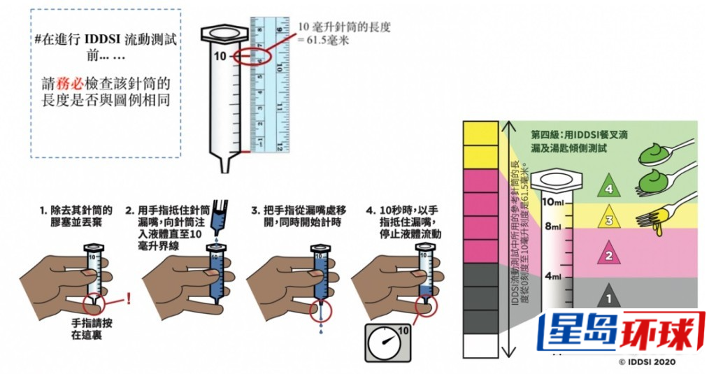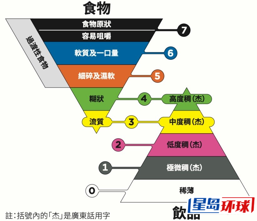 ▲國(guó)際吞咽障礙飲食標(biāo)準(zhǔn)化創(chuàng)辦組織(IDDSI)訂立一套適用于吞咽障礙患者的8級(jí)制飲食框架,各個(gè)級(jí)別皆有簡(jiǎn)易測(cè)試方法。