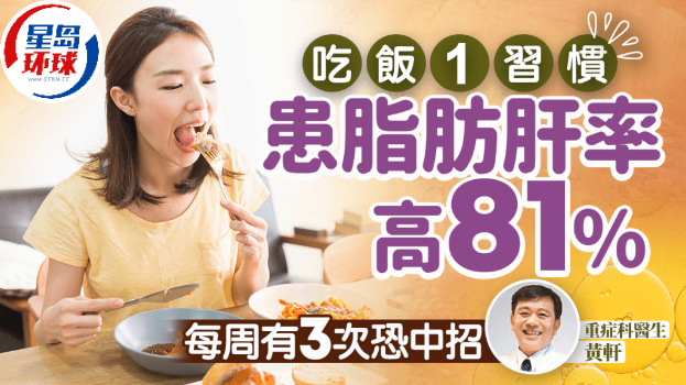 · 每周有兩次以上快速進食(每餐時間少于5分鐘),比起用餐時間15分鐘或以上的人士,患脂肪肝的風險提高81%。