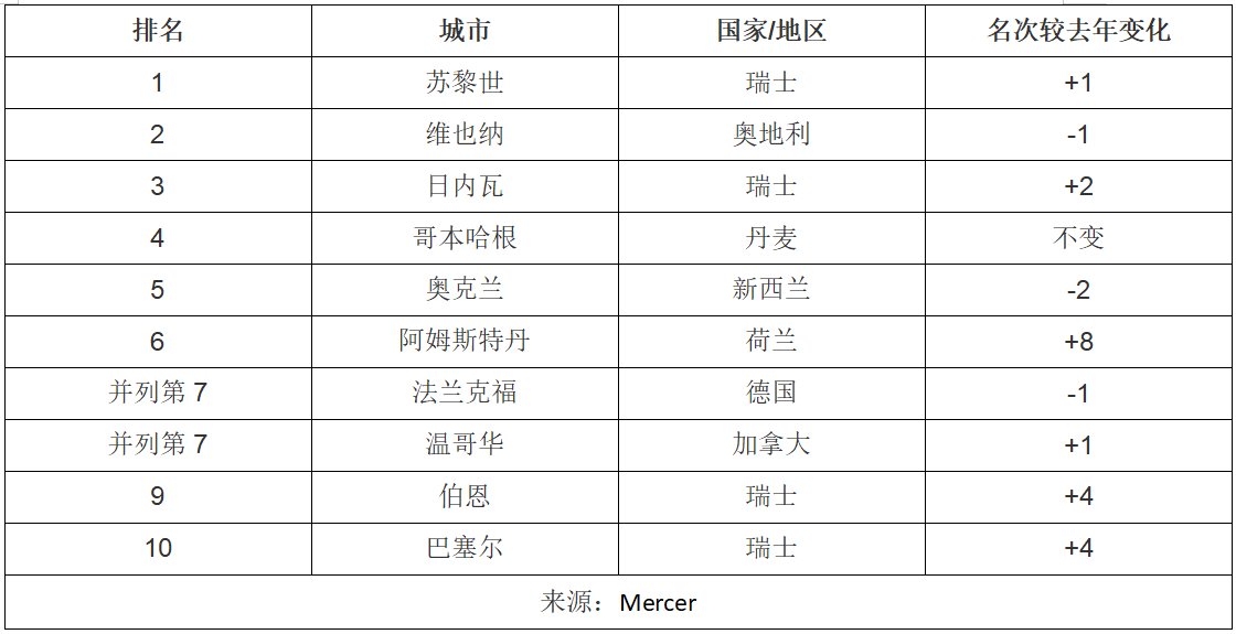 全球城市生活質(zhì)素排名首10位