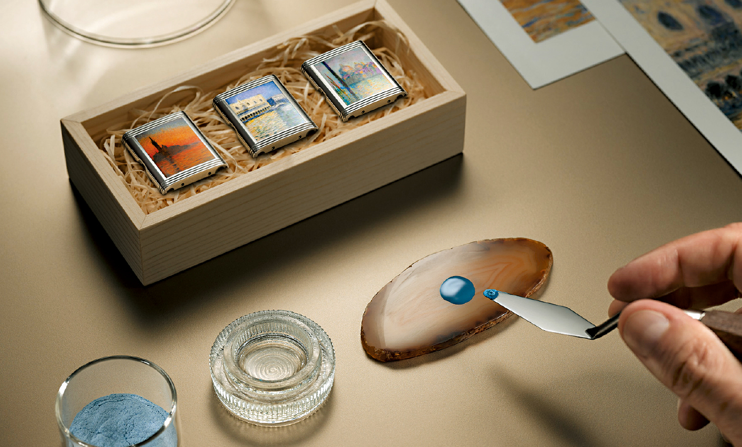 積家最近推出三款全新限量版Reverso Tribute Enamel,不但利用大明火琺瑯配合扭索飾紋工藝,為每款腕表上的特色圖案配上藍(lán)、綠或透明藍(lán)色表盤(pán),還以琺琺微繪工藝在底蓋上重現(xiàn)印象派大師莫奈以威尼斯為主題的畫(huà)作,藉以向這位偉大畫(huà)家及充滿藝術(shù)氣息的威尼斯致敬。 莫奈的威尼斯系列主要在其畫(huà)家生涯的晚期完成,以細(xì)膩的筆觸描繪當(dāng)?shù)刂ㄖ莫?dú)特光影。 莫奈在逗留這城市的十個(gè)星期中,游走逾十個(gè)地點(diǎn)并完成了三十七幅作品,當(dāng)中三幅被積家珍稀工藝工作坊(Métiers Rares Workshop)選為限量版Reverso腕表的底蓋畫(huà)作,包括《黃昏的圣喬治馬焦雷島》、《威尼斯大運(yùn)河》及《總督宮》。