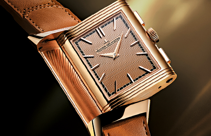 繼去年推出Reverso Tribute Chronograph不銹鋼和玫瑰金兩個(gè)版本后,積家今年追加一款更奢華的全玫瑰金版本,表殼、表盤(pán)、小時(shí)刻度和機(jī)芯夾板一律以玫瑰金制作,不止正面帶飾紋的兩針表盤(pán)金光閃閃,背面配置30分鐘逆跳累計(jì)的鏤空計(jì)時(shí)表盤(pán),同樣金光燦爛。