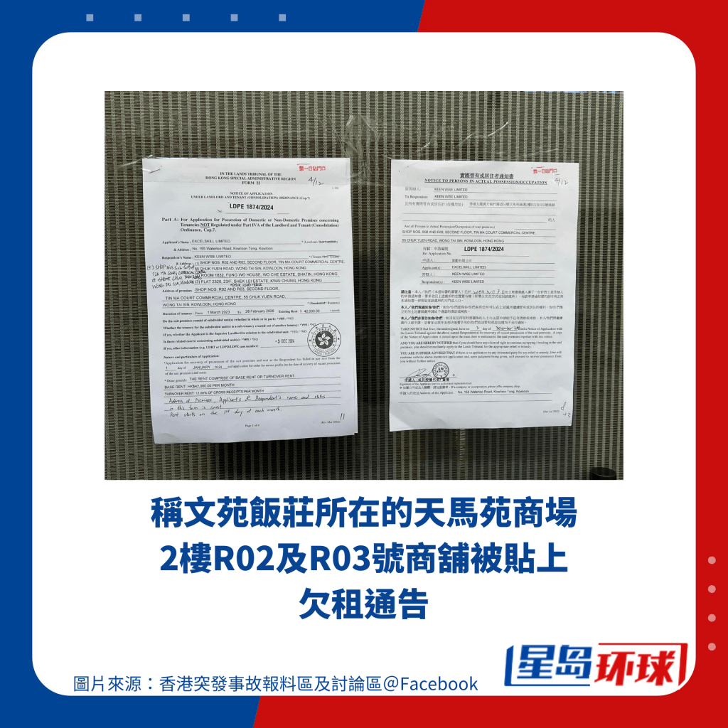 昨日(12月4日),有網(wǎng)民在Facebook群組“香港突發(fā)事故報料區(qū)及討論區(qū)”中發(fā)帖,稱文苑飯莊所在的天馬苑商場2樓R02及R03號商鋪被貼上欠租通告,內(nèi)容寫到文苑飯莊的租約期為2023年3月1日至2026年2月28日,而租用者自2024年1月起未能繳付每月$42,000的租金,現(xiàn)須支付欠交的租金以及每月總收益的12%。文苑飯莊大門前的另一則通告則寫到業(yè)主已于2024年12月3日起向土地審裁處入稟申請通知書,要求以交吉方式收回店鋪。