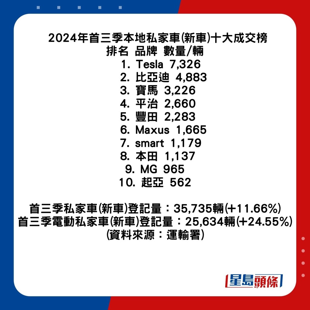 ▲2024年香港9月私家車(新車)成交榜十大排名