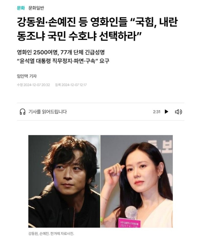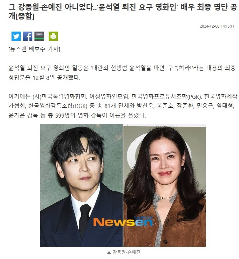 尹錫悅昨日(7日)就事件鞠躬道歉,國會于當?shù)貢r間昨日下午5時正式召開彈劾案,最終在執(zhí)政國民力量黨表明反對彈劾案集體離場后,尹錫悅彈劾案在票數(shù)不足的情況下未能通過。而日前傳出電影界的聯(lián)合聲明中,曾提到名導奉俊昊、姜棟元、孫藝珍、全智賢、金高恩等知名演員也有發(fā)聲,今日卻峰迴路轉,有韓媒報道聯(lián)署名單的演員僅同名同姓,與大眾認知上的演員毫無關系。