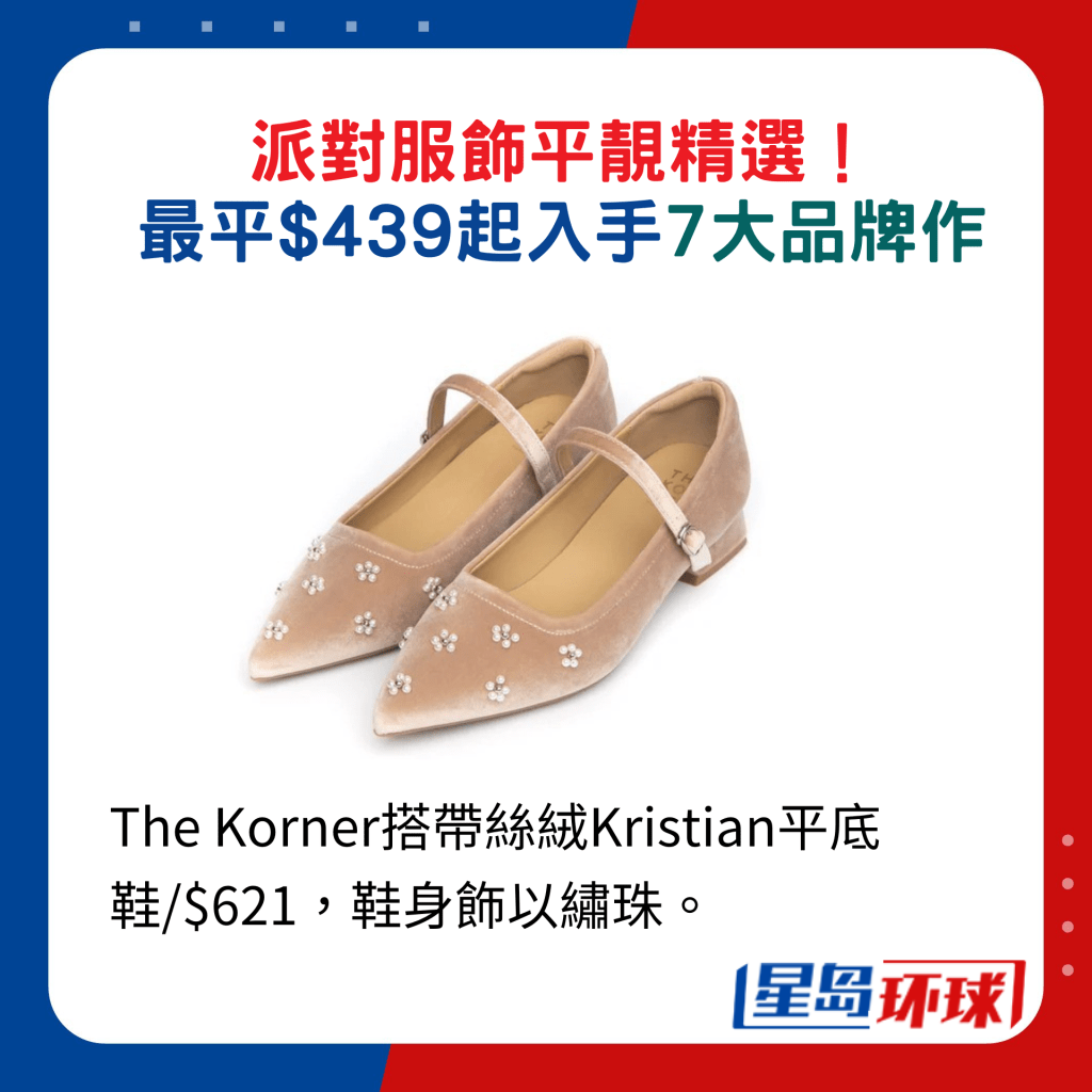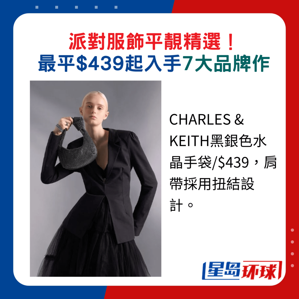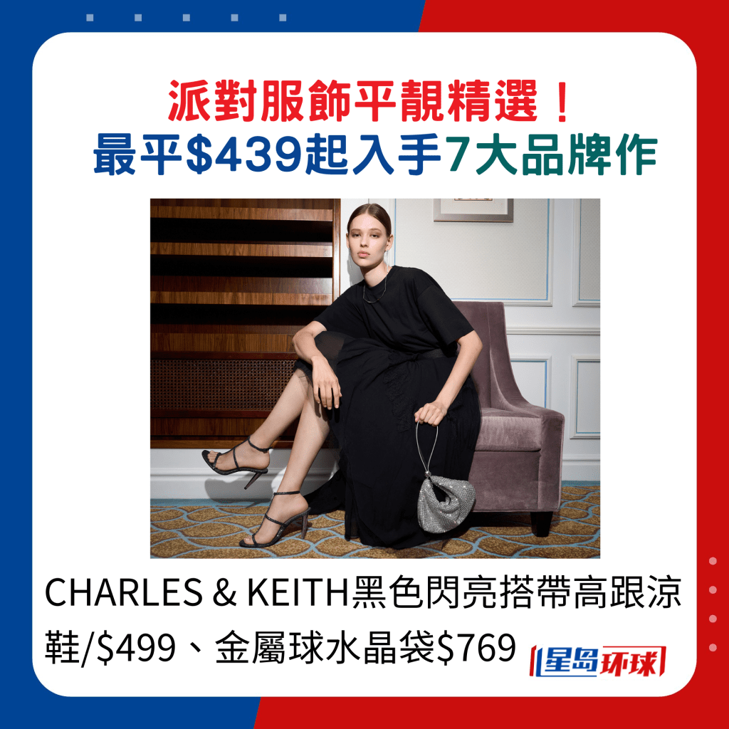 想為派對造型加分?! 選對配飾相當重要,Bling Bling閃亮設計最是迎合節(jié)日色彩。CHARLES & KEITH夢幻節(jié)慶系列包羅各款手袋及鞋履,以經(jīng)典的黑、 銀、粉紅及金色為主調(diào),統(tǒng)統(tǒng)用上水 晶、閃亮元素及金屬光物料裝飾,華麗感十足。 其中一款水晶手袋,肩帶綴以金屬球裝飾,亦可將肩帶放入金屬球當成手挽,靈活配襯不同派對造型。 小資女熱捧的香港鞋履The Korner,也有亮麗選擇,一款絲絨制平底鞋,綴以立體的繡珠裝飾,典雅又高貴。
