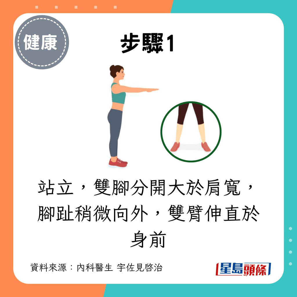 站立,雙腳分開大于肩寬,腳趾稍微向外,雙臂伸直于身前。