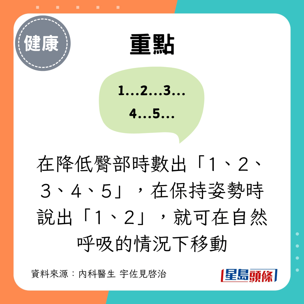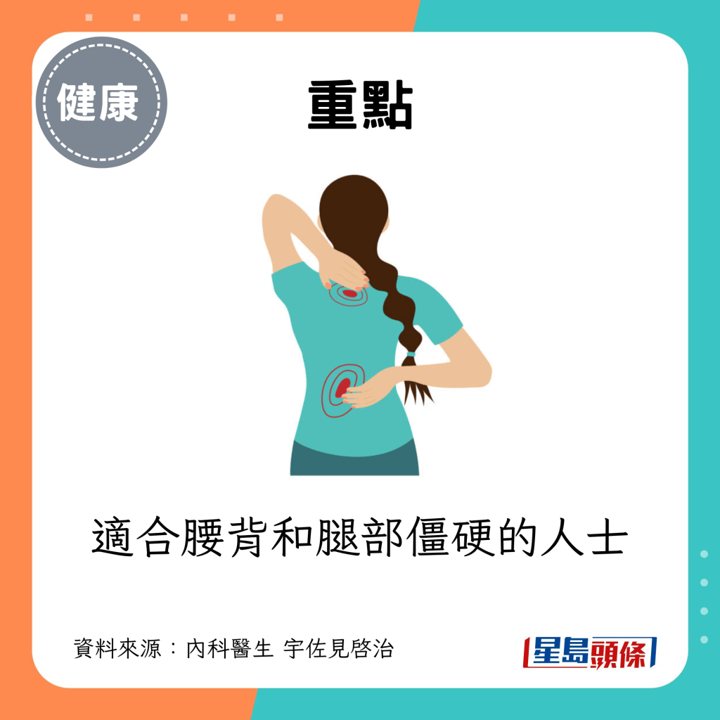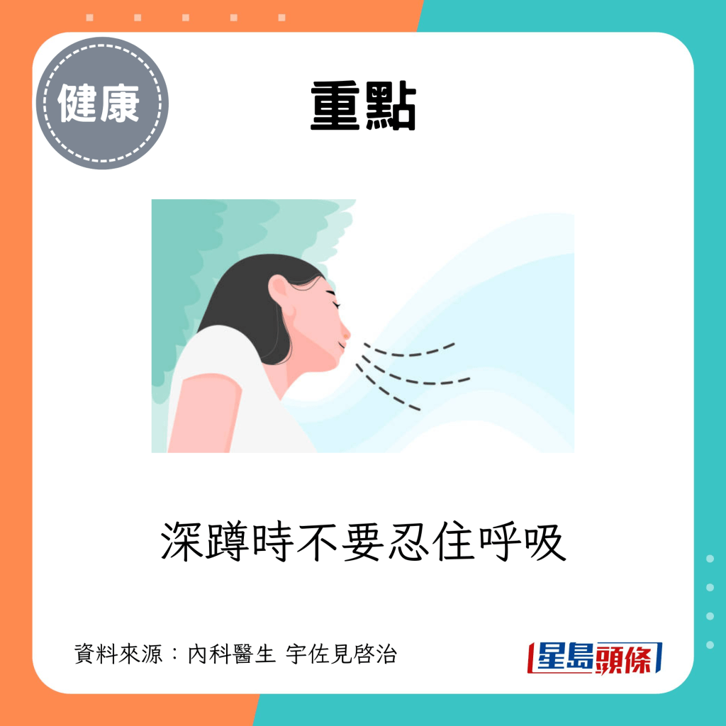 適合腰背和腿部僵硬的人士,與基本版一樣,深蹲時不要忍住呼吸。