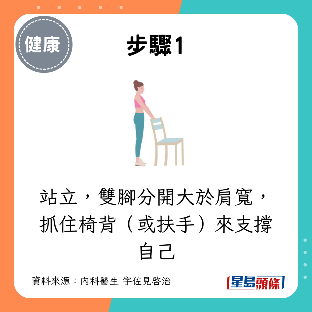 站立,雙腳分開大于肩寬,抓住椅背(或扶手)來支撐自己。