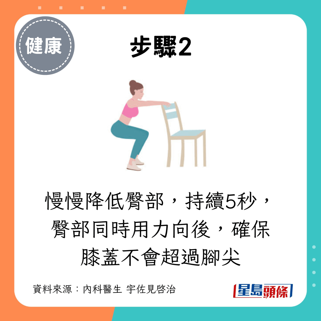 當(dāng)大腿下降到與地面平行時,停止向下并保持該姿勢2秒,抓住椅背或扶手慢慢站直。