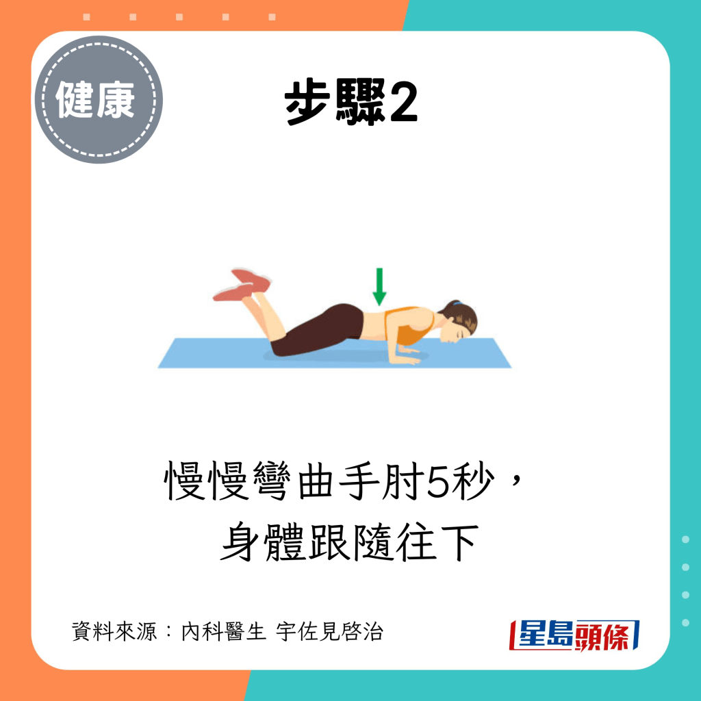慢慢彎曲手肘5秒,身體跟隨往下。