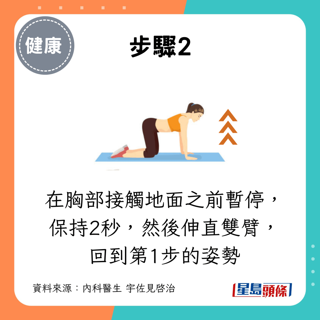 在胸部接觸地面之前暫停,保持2秒,然后伸直雙臂,回到第1步的姿勢。
