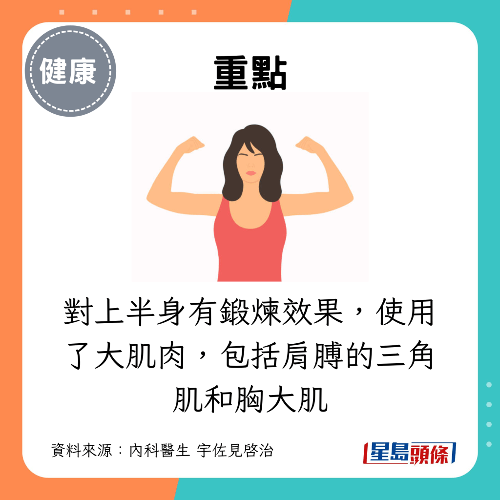 這對于上半身有鍛煉效果,使用了大肌肉,包括肩膊的三角肌和胸大肌。