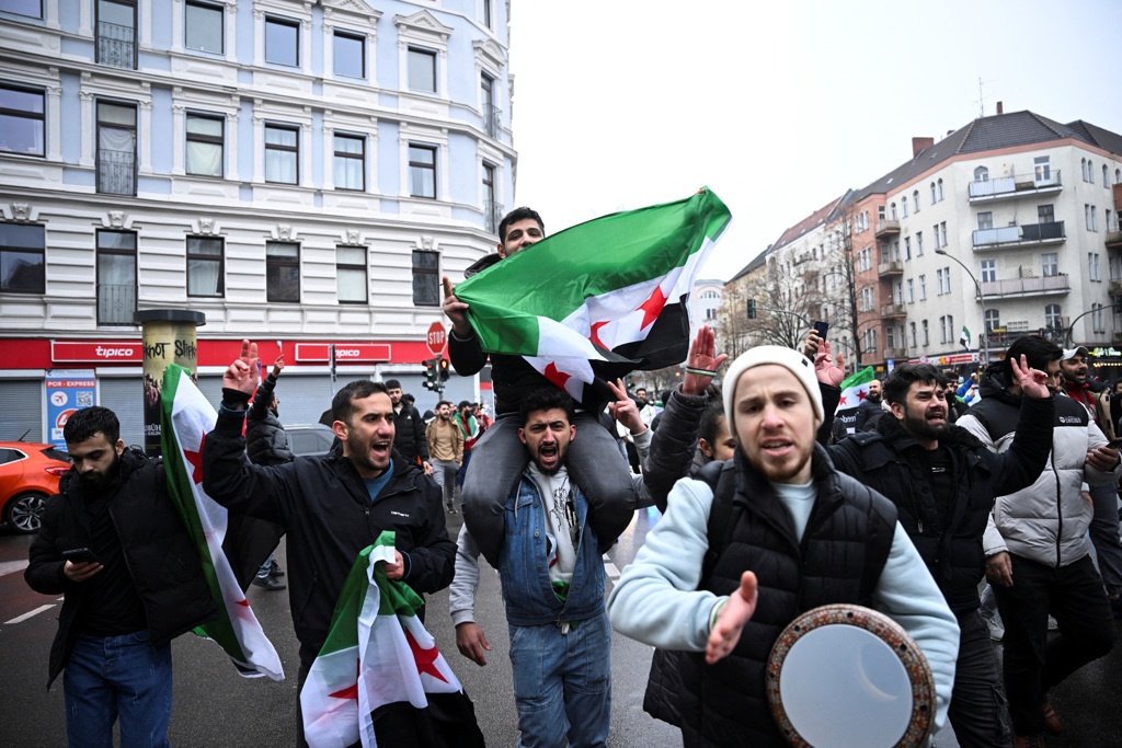 2024年12月8日,德國柏林?jǐn)⒗麃喎纯管娦纪品瓟⒗麃啺⑺_德政府后,人們舉著敘利亞反對派旗幟聚集在柏林一處廣場。 路透社