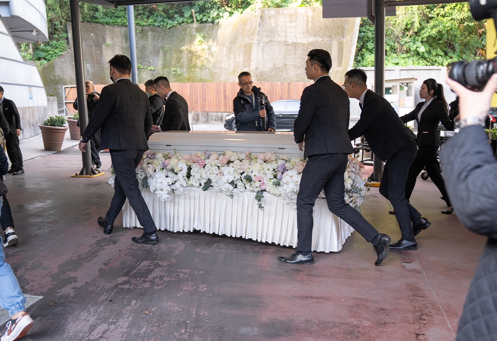 瓊瑤家祭儀式完成,家屬稍早推棺木至火葬場。