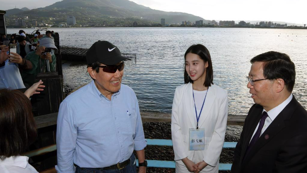 馬英九(左)、陸生彭弋航(中)、清華大學(xué)黨委書記邱勇(右)等人在淡水河邊閑聊。