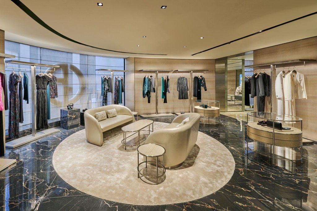 早于2013年開業(yè)的廣東道精品店,經(jīng)翻新后,兩層式的店鋪面積擴(kuò)充至962平方米,銷售區(qū)域亦達(dá)676平方米,店內(nèi)以具有大理石效果的陶瓷及鉑金金屬裝飾打造的樓梯貫通上下樓層。一樓主售男及女裝成衣、手袋配飾、鞋類系列及美妝區(qū);二樓則是女裝晚禮服、高級(jí)珠寶、男士量身訂制(Made-to-Measure/MTM)西裝、正裝及腕表專區(qū)。
